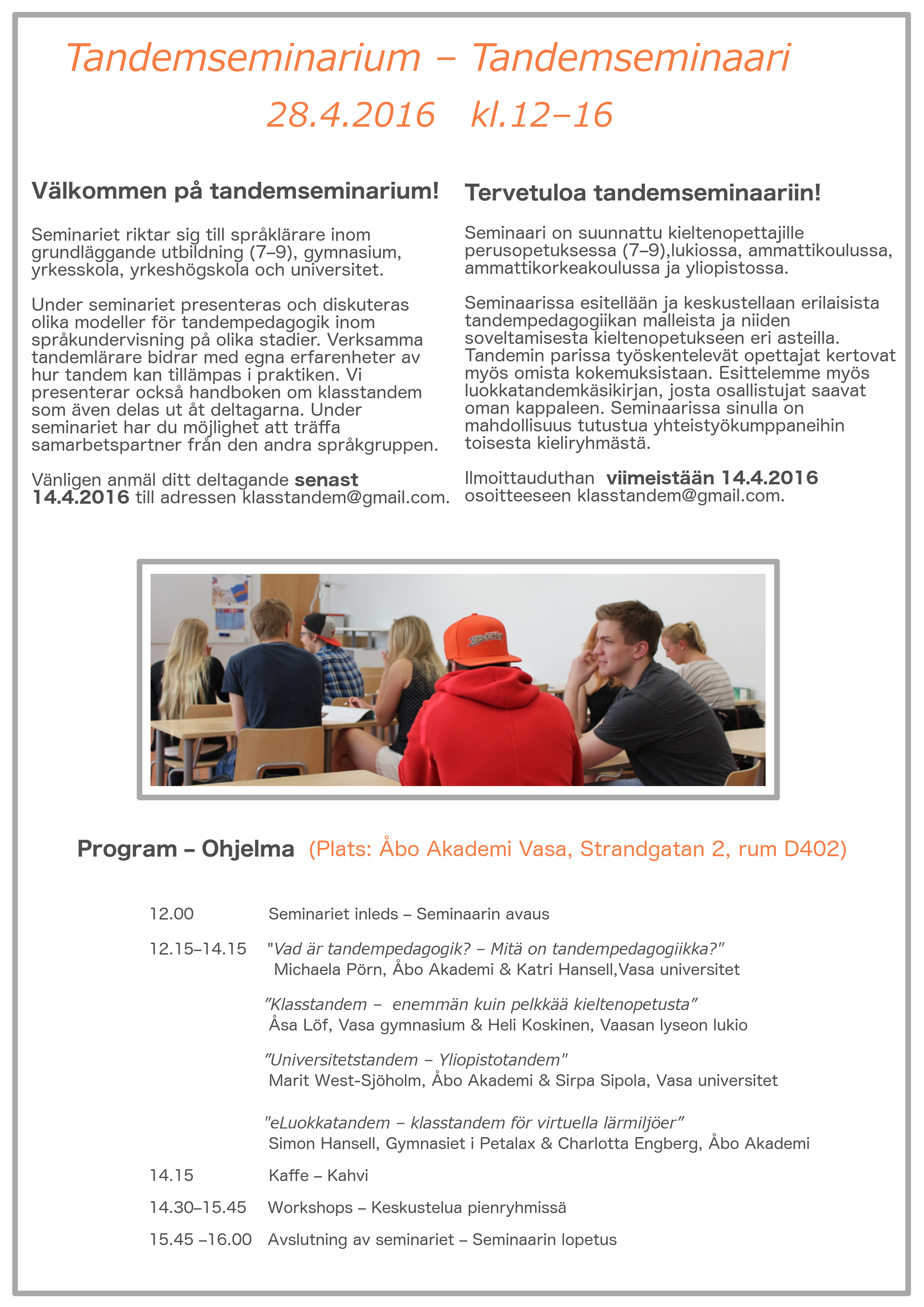 28. huhtikuuta 2016 Tandemseminaari Vaasassa, Luokkatandemkäsikirja julkaistaan